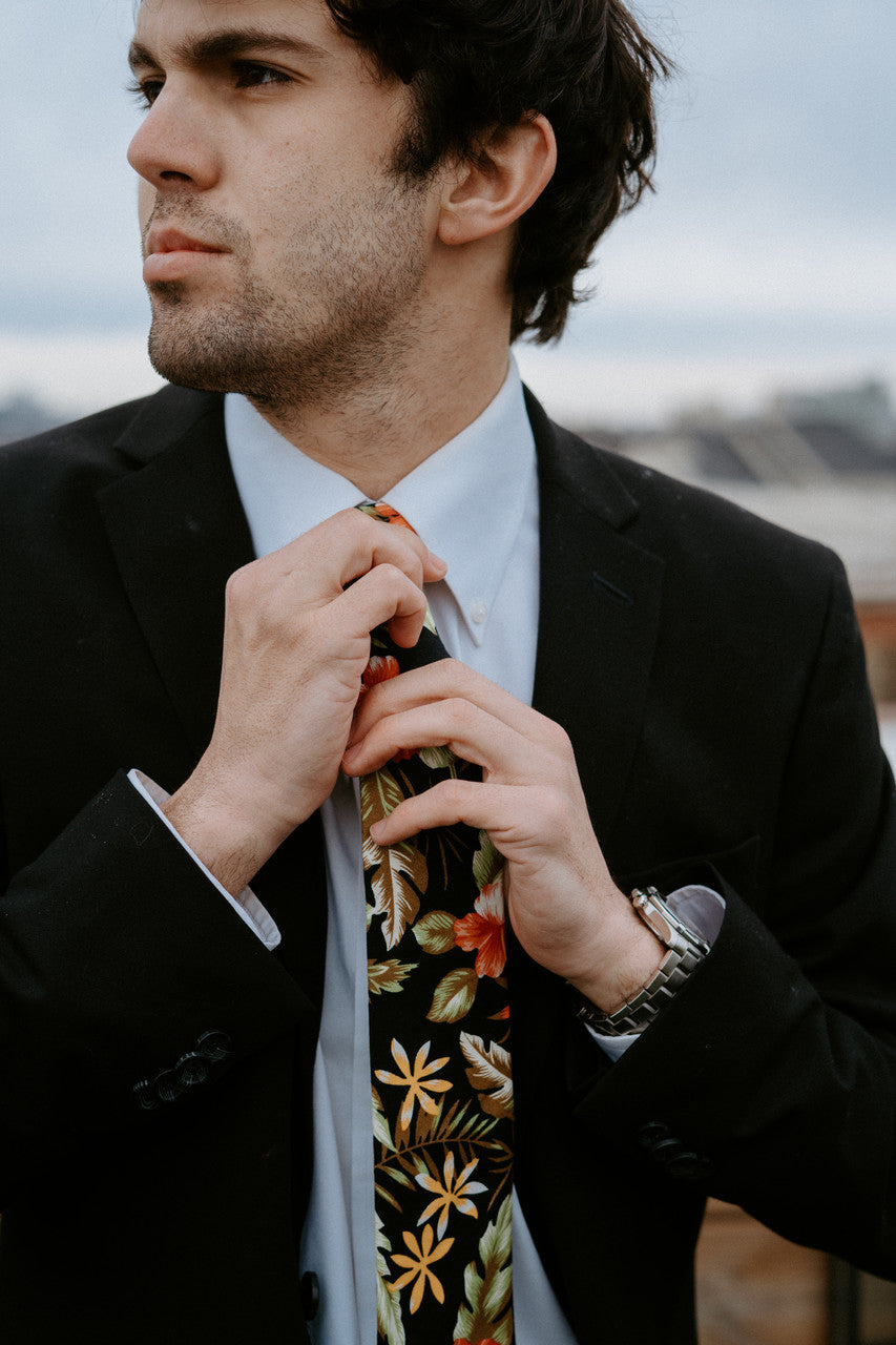 "The Tropics" Is an awesome Tie! This tie is named after those fun beach days and traveling to the tropics we all miss!!! This black floral tie shows vibrant colors and shades of green, red and yellow! And is just tons of fun! Made of 100% cotton it is easy to clean and will look great with any dress shirt!